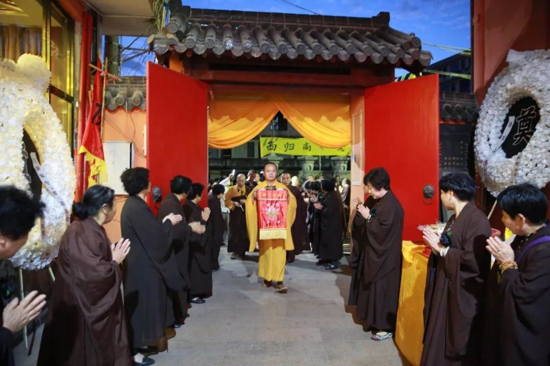 庄严高广的寺院中,处处悬挂着素灯灵幔。大愿楼前所设的灵堂内,敬奉着长老的遗像。