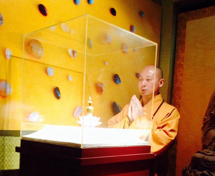 传喜法师领众在供奉舍利的金瓶前,虔诚礼拜本师释迦牟尼佛,并供养《心经》、往生咒。率领众弟子口称“南无阿弥陀佛”,转绕出土石函,祈佛加被,开启智慧,妙明现前。