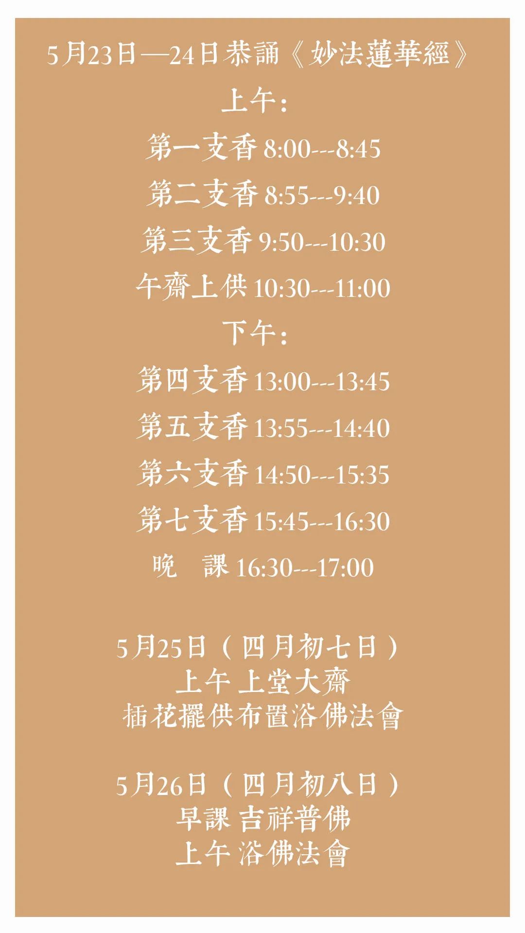 5月26日,四月初八佛诞吉日,将随早课举行消灾延寿吉祥普佛,并于上午举办浴佛法会,祈愿国泰民安,风调雨顺,佛法昌隆,人心同善;祈愿大众远尘离垢,身心清净,一切时中,吉祥如意!