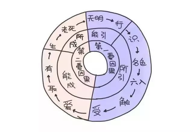 ●轮回的因有远因和近因;轮回的果也有远果和近果。远因是什么呢?远因是前世的无明和前世造的善恶业。近因是什么呢?近因是指现世的爱、取、有。远果是指后世的生和老死,而近果是指现世从识到受的五个缘起支。