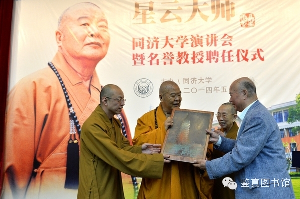 随后,同济大学建筑与城市规划学院教授路秉杰和建筑学本科生戴方睿作为师生代表向星云大师赠送了纪念品——路秉杰教授主持设计的常州天宁宝塔雕刻和同济大学教师编著的《中国古代建筑文献集要》丛书。星云大师则向同济回赠了自己新近出版的全套《百年佛缘》图书。